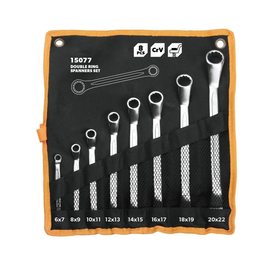 Manerul larg cu care sunt concepute aceste chei permite utilizatorului sa aplice confortabil putere ridicata, iar Offsetul este de 10 de grade pentru acces sporit la dispozitivele de fixare incastrate.Setul contine 8 chei inelare cu 2 capete fabricate din otel crom vanadium, pentru o rezistenta si durabilitate superioara.