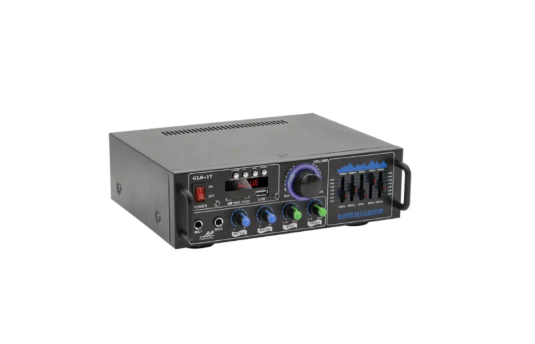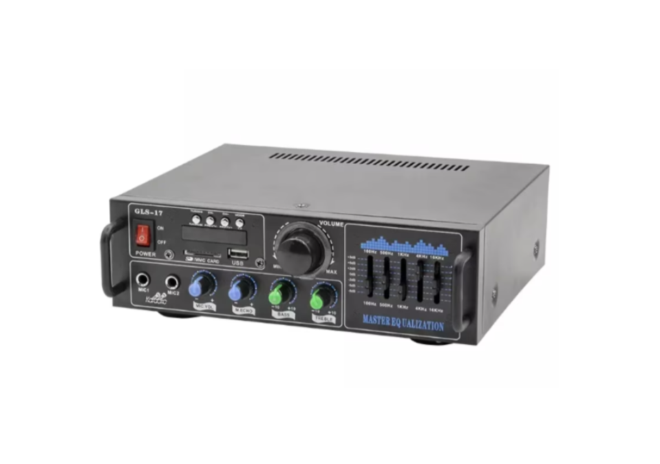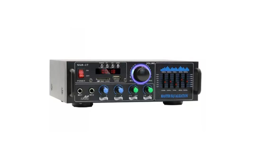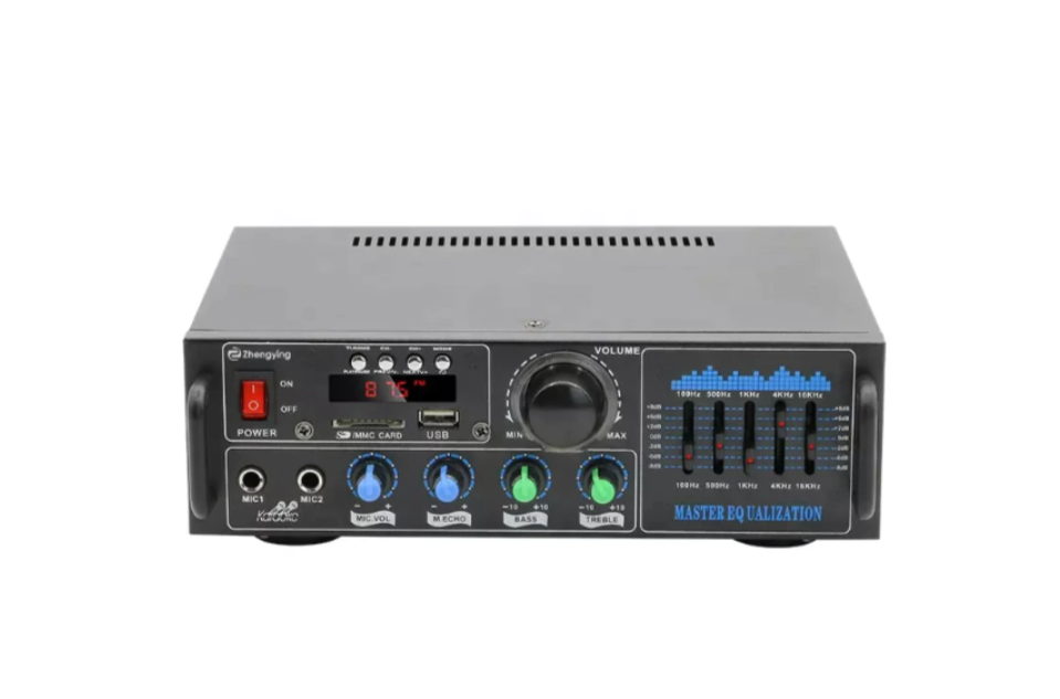 Amplificatorul de sunet compact, profesional imbunatatit, dispune de un buton clar si receptiv pentru comutatorul de pornire si comenzile cu butonul rotativ pentru volumul microfonului, echilibru, bas, inalte, volum principal si sursa de intrare.