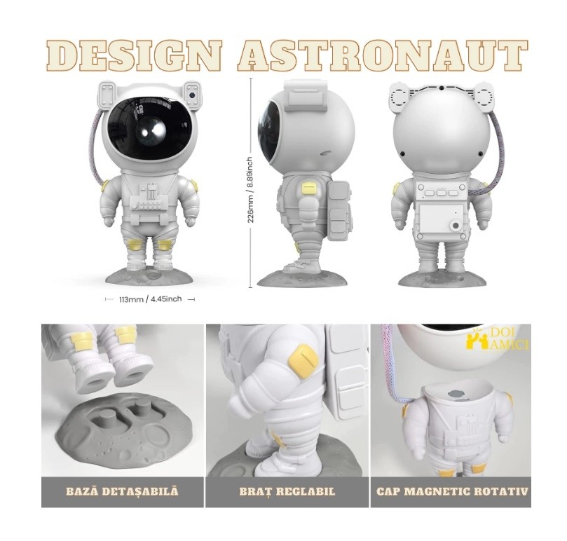 Design atragator si simpatic ce il face compatibil cu orice context, fie din postura de element de decor, fie ca „actor” principal in momentele importante din viata familiei. Proiectorul Astronaut poate fi folosit in casa sau in masina, in cort sau rulota, poate reda lumini si efecte nebula naucitoare, are telecomanda si sistem de temporizare (util pentru camera bebelusilor si a copiilor seara, inainte de somn), este rezistent si sigur de folosit in mainile copiilor atat si a parintilor.