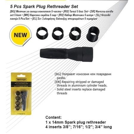 5pcs/Kit reparatie filet bujie 14mm TMP - Destinat reparatiei filetelor de bujii deteriorate din chiluase - Contine: 1 buc 14mm rectificatior filet; 4 insertii filet 3/8", 7/16", 1/2", 3/4" lungimeImaginile, culorile si caracteristicile descrise au caracter informativ și pot contine mici inadvertente sau diferi ocazional fața de produsele prezentate pe site.