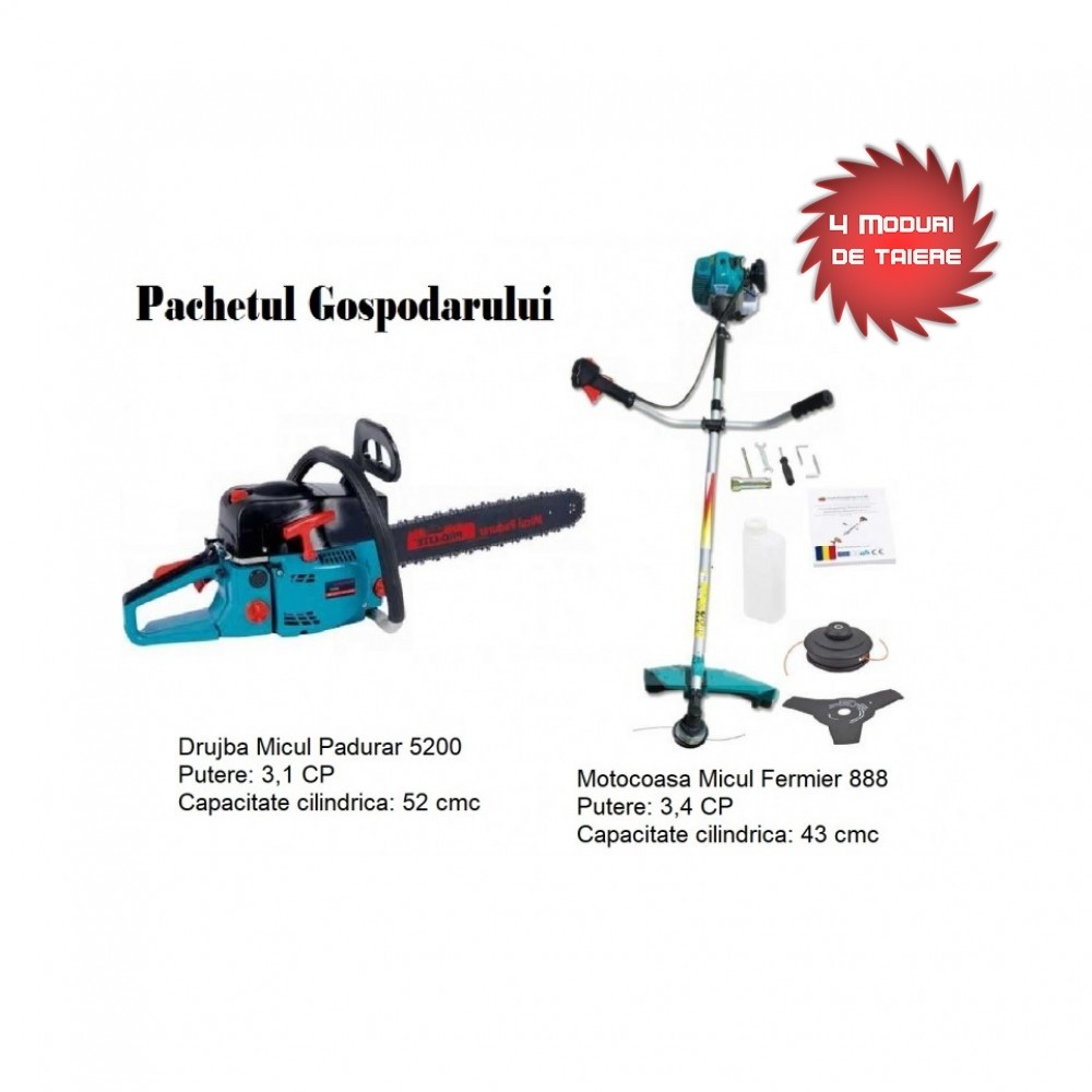 Pachetul Gospodarului contine cele mai importante scule pentru gospodaria dumneavoastra: Drujba si Motocoasa , doua unelte care nu ar trebui sa va lipseasca.