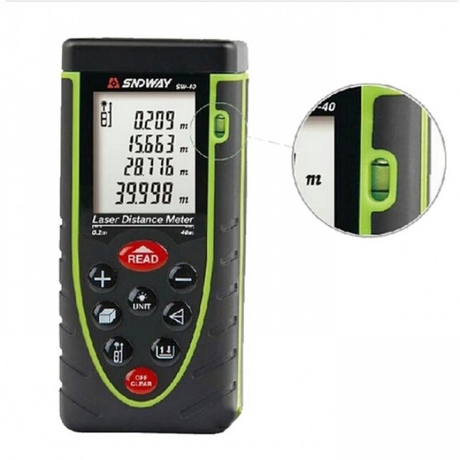 Instrument portabil pentru masurat distante,arii si volume cu laser. Cu ajutorul acestui aparat puteti masura cu usurinta si precizie distante de pana la 40m, fiind prevazut si cu bula de nivel. De asemenea se poate calcula aria ,diagonala,cateta si volumul, avand functia Pitagora.
