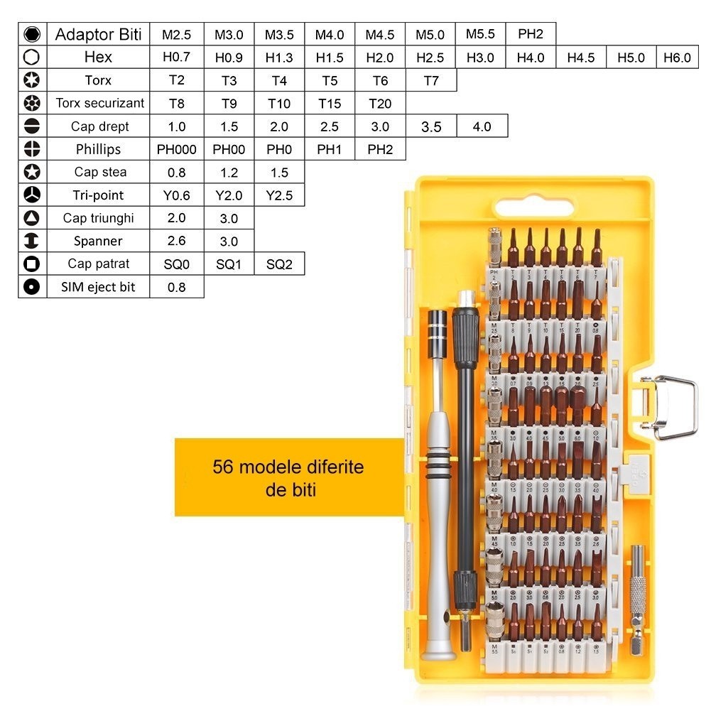 Aceasta trusa contine 56 de biti, fabricati din chrome-vanadium,surubelnita din aluminiu, prelungitor de 56 mm, brat flexibil si un adaptor standard de 6 mm.Marimea adaptorilor :