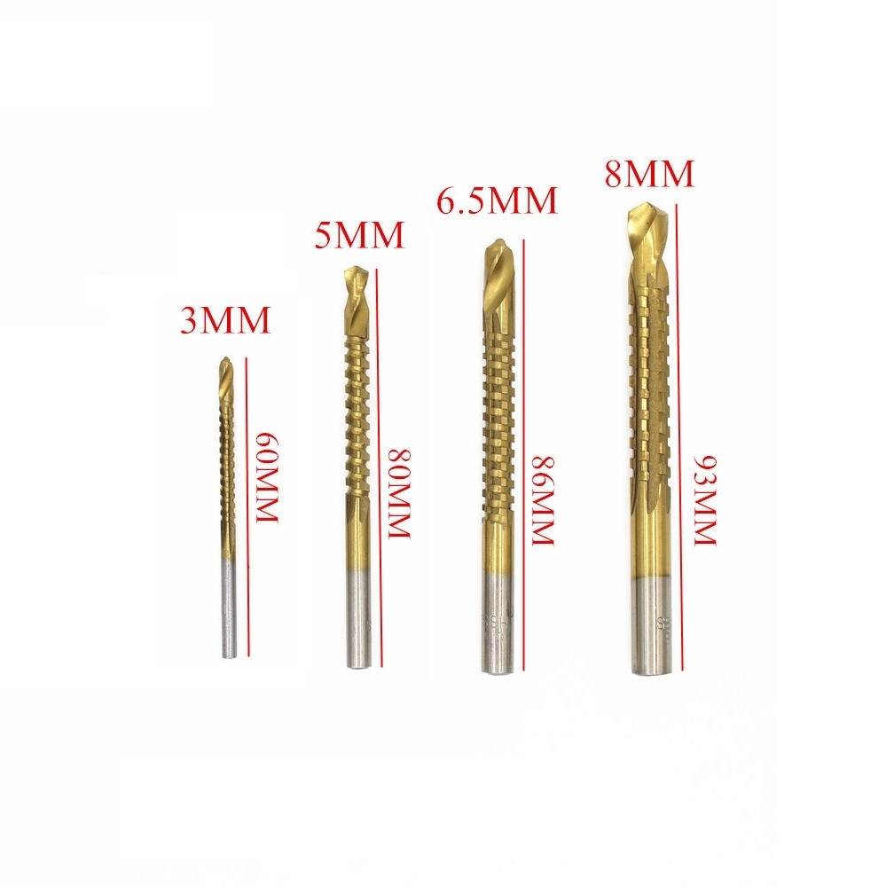 Acest set contine 4 spirale de 3;5;6.4;8mm petru metal cu 5 muchii de taiere recomandate pentru forarea sau taierea metalului, lemnului, plasticului sau alte materiale.