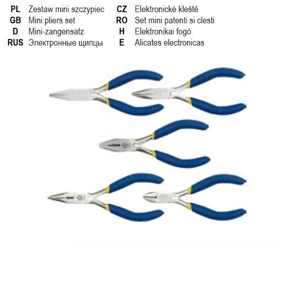 Setul contine 5 mini clesti de precizie cu diverse forme si intrebuintari cu manere aderente si izolate.