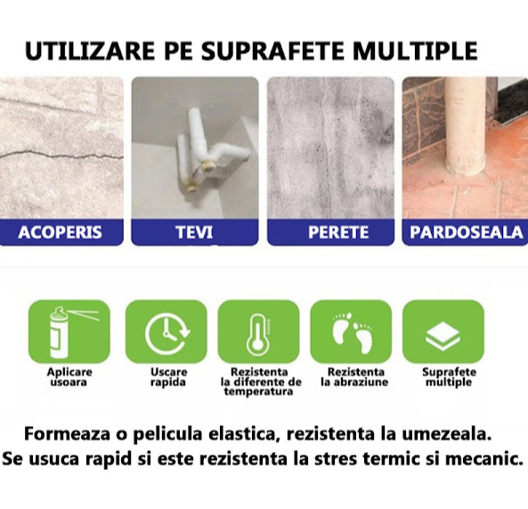 Spray-ul poate fi vopsit, este impermeabil si rezistent la intemperii. Protejeaza metalele impotriva coroziunii si nu contine bitum si silicon.