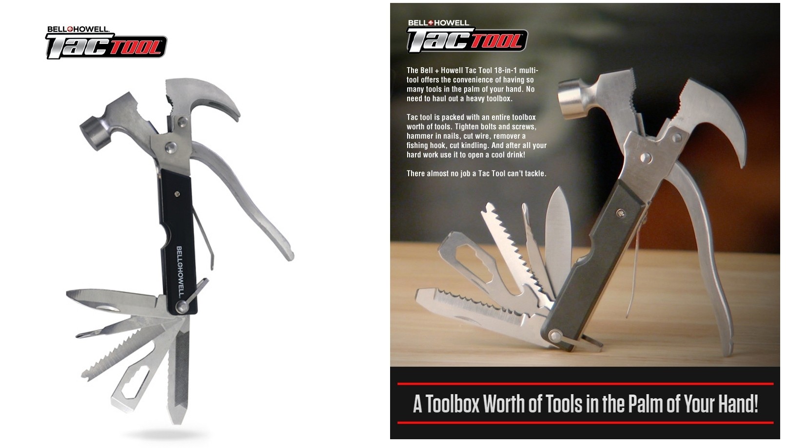 Instrumentul Tac este un dispozitiv inspirat din dispozitivele folosite de trupele speciale de elita ce inglobeaza 18 scule diferite intr-o singura unealta multifunctionala versatila de la taiere, inșurubare sau orice provocare indiferent de locul in care aveți nevoie.