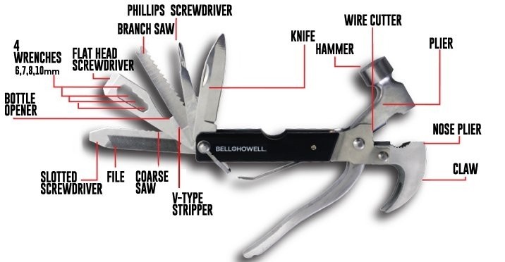 Aceasta unealta multifunctionala inlocuieste cu succes o intreaga trusa de scule, un dispozitiv 18in1 de buzunar suficient de rezistent pentru a face fata oricaror conditii de utilizare, tactic, camping, supravietuire, unealta pentru casa sau pentru diverse reparatii.